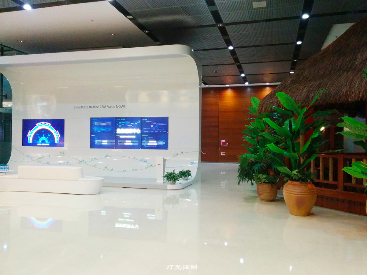此次打造的展厅以展示华为的科技产品和技术手段为主,以传统简装为基调,白色为主色调,蓝色点缀。所有展示内容包括产品影片、华为平台、产品程序、解决方案程序、动态海报等都是通过大屏或触控大屏呈现。以最直观最直接的方式将华为的展示意图表现的淋漓尽致。