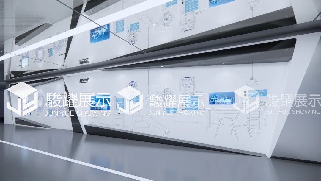 滑轨屏:在类似坐标轴的展墙上,布置展板或液晶拼接屏作为背景墙,同时在前面安置一组可滑动的机械结构以悬挂液晶电视。